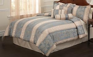 Product Description : Classic scroll with an aqua blue base with woven in details. Includes 1 queen comforter 86x86 inches with two standard shams (20x26 inches), bed skirt to fit mattress 60x80 inches. 3 BONUS PILLOWS included to add that final touch to your bed. Jacquard woven polyester and cotton face cloth with 100% hypoallergenic p
